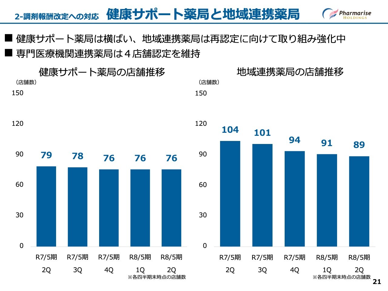 スライド下段の表は、四半期ごとの調剤技術料の推移です。技術料単価は計画を上回っているものの、処方せん枚数が想定より少なかったため、当四半期の実績は計画に達しませんでした。ただし、前期比では大幅に増加しています。