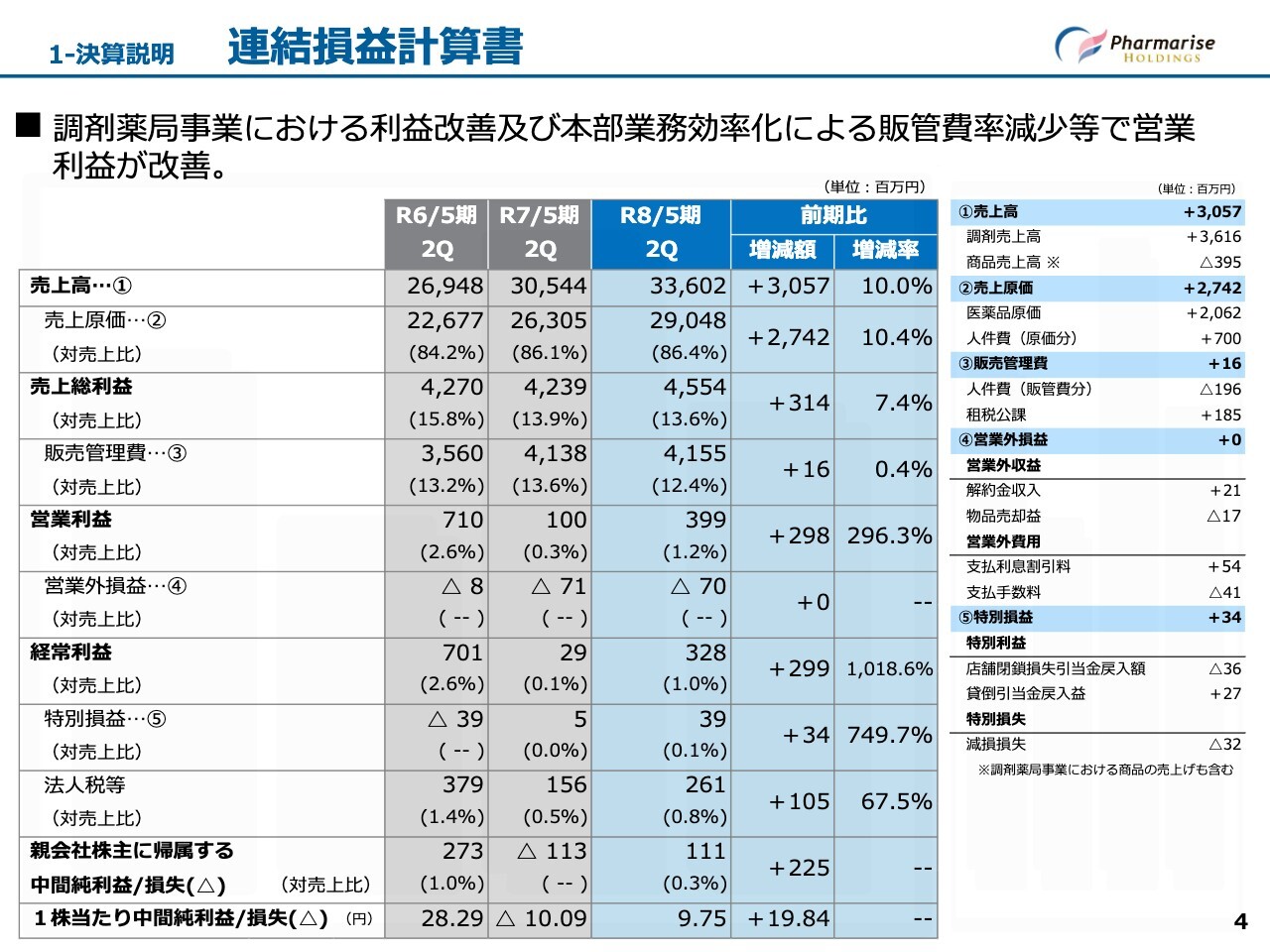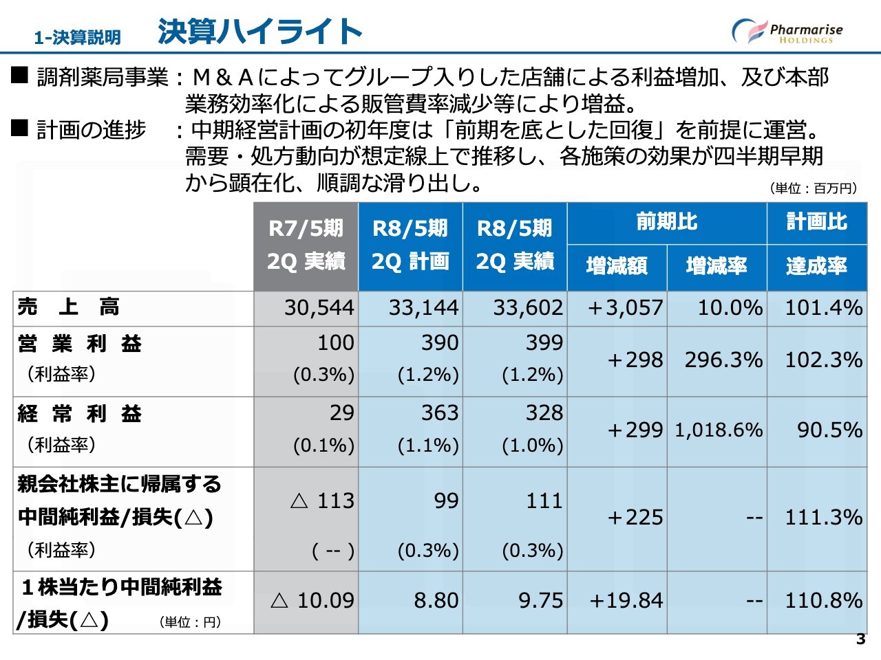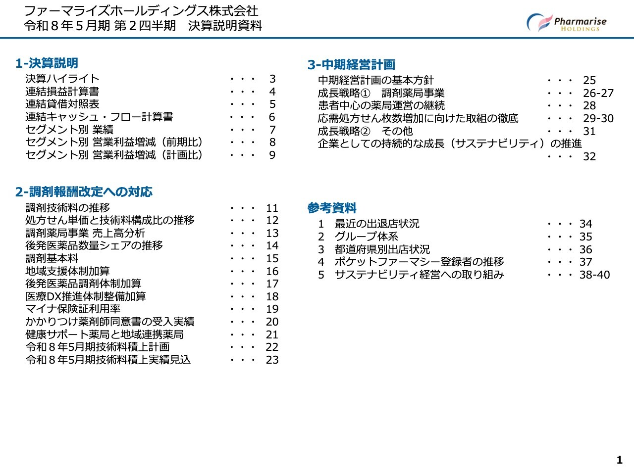 ファーマライズホールディングス株式会社、令和8年5月期第2四半期の決算説明を始めます。本日は3部構成です。