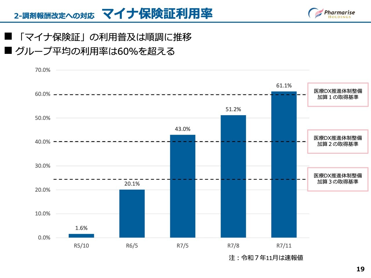 当社グループの平均では、医療DX推進体制整備加算において、もっとも高い点数である加算1の基準である利用率60パーセントを超えています。