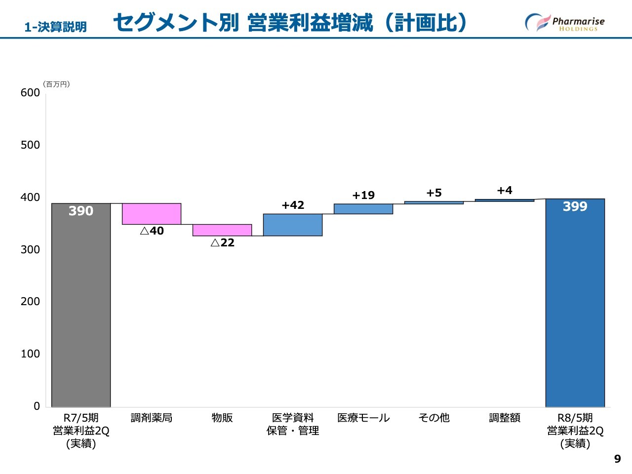 処方せん応需枚数は猛暑による受診控えや処方日数の長期化、小児科・耳鼻科を中心とした流行性疾患の減少の影響で想定を下回りました。一方、平均処方せん単価が406円と想定を上回ったことで、計画を達成しています。