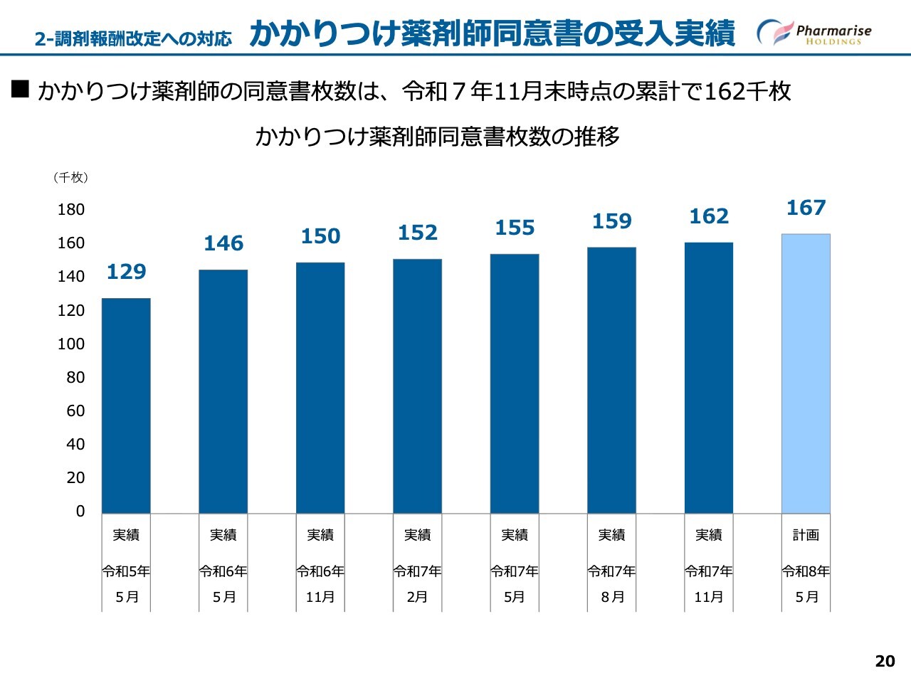 かかりつけ薬剤師同意書の受入実績です。当期は新たに約1万3,000人のかかりつけ患者の増加を見込み、令和8年5月期末の計画として16万7,000枚を予定し、順調に推移しています。