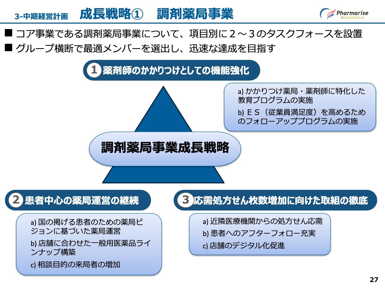 主要事業である調剤薬局事業の成長戦略については、迅速かつ確実に進捗させるため、項目ごとに2つまたは3つのタスクフォースを設置しました。