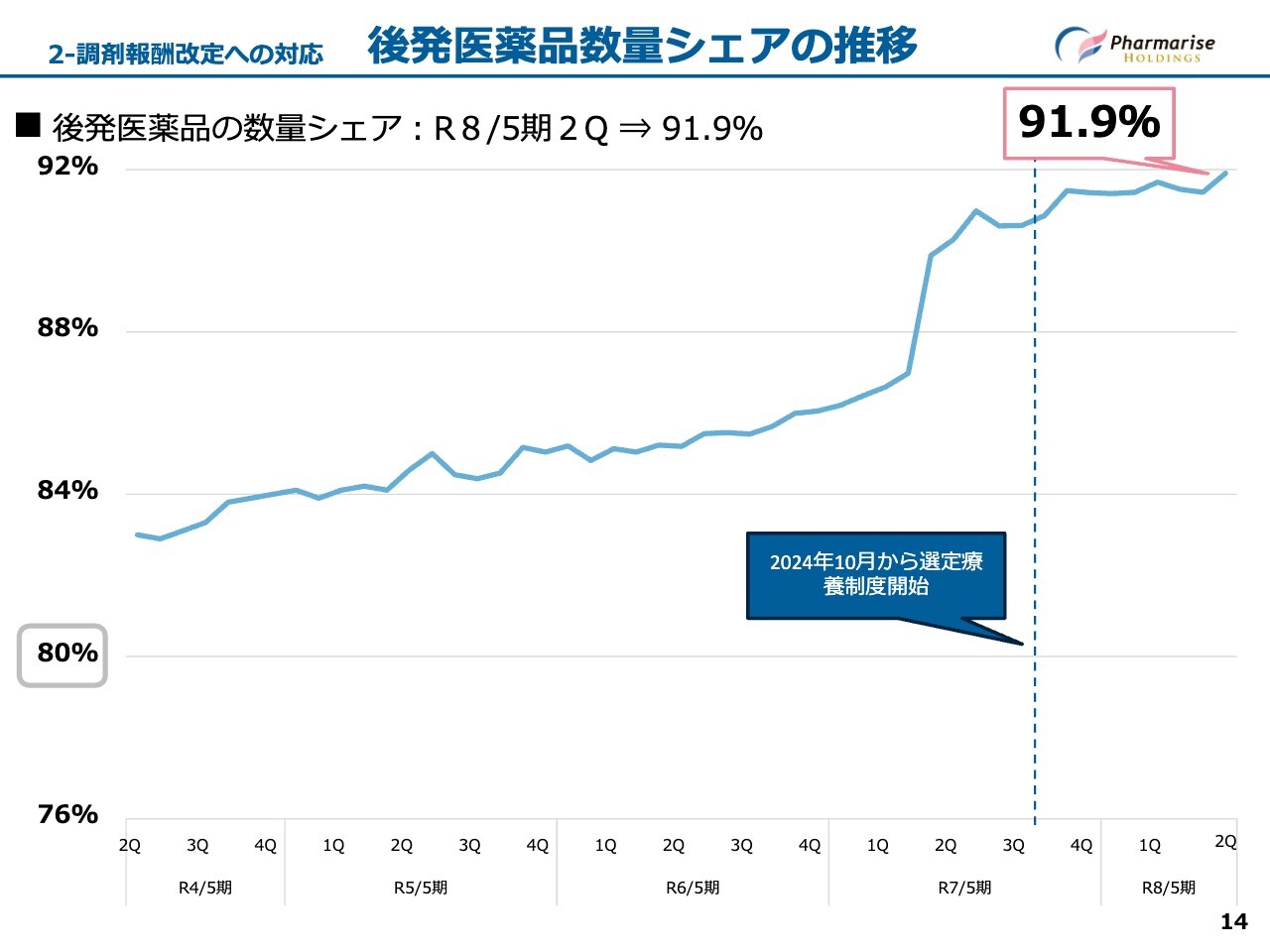 スライドのグラフは、当社における後発医薬品の数量シェアの推移を示しています。昨年10月に導入された長期収載品を先発医薬品で調剤した場合に患者が一部自費負担となる選定療養制度の影響で、数量シェアが大きく伸びました。当期も引き続き高水準を維持しています。