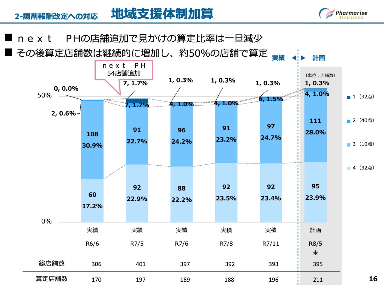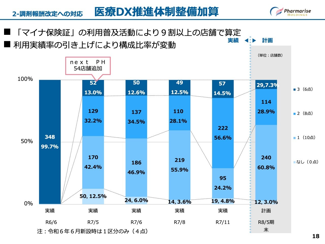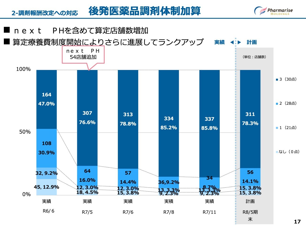 スライドは、調剤基本料の区分別比率をまとめたグラフです。前期第3四半期にnext PH社がグループに加わったことで、一時的に各区分の比率が変動しました。