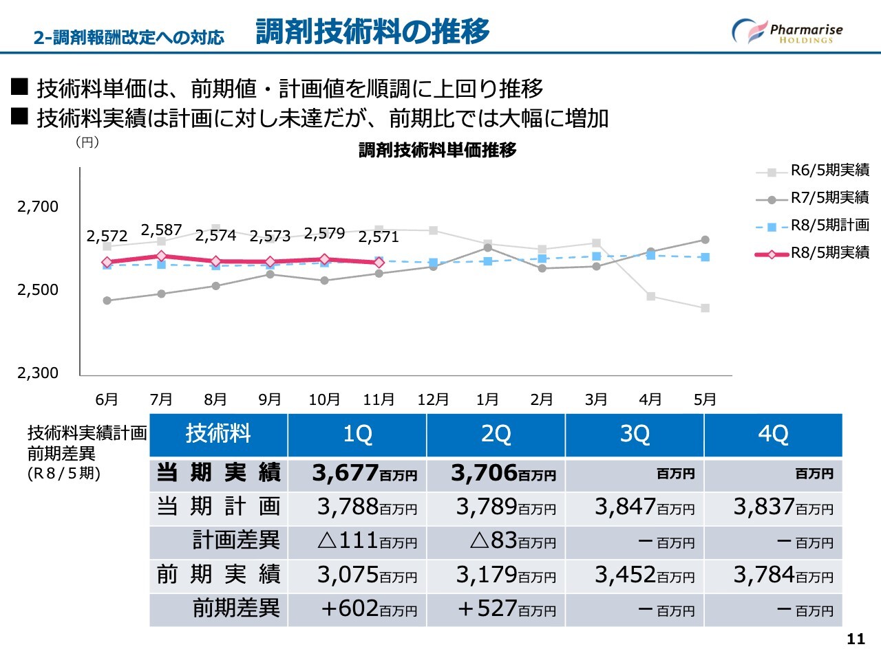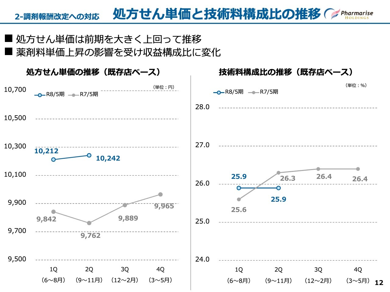 技術料単価は、300店舗以上のチェーングループ適用により大きく引き下げられた令和6年4月以降、全社的に地域支援体制加算などの技術料算定に注力した結果、令和7年5月期の第4四半期時点で元の水準に戻りつつありました。当四半期においても、前四半期から引き続き計画を上回って進捗しています。