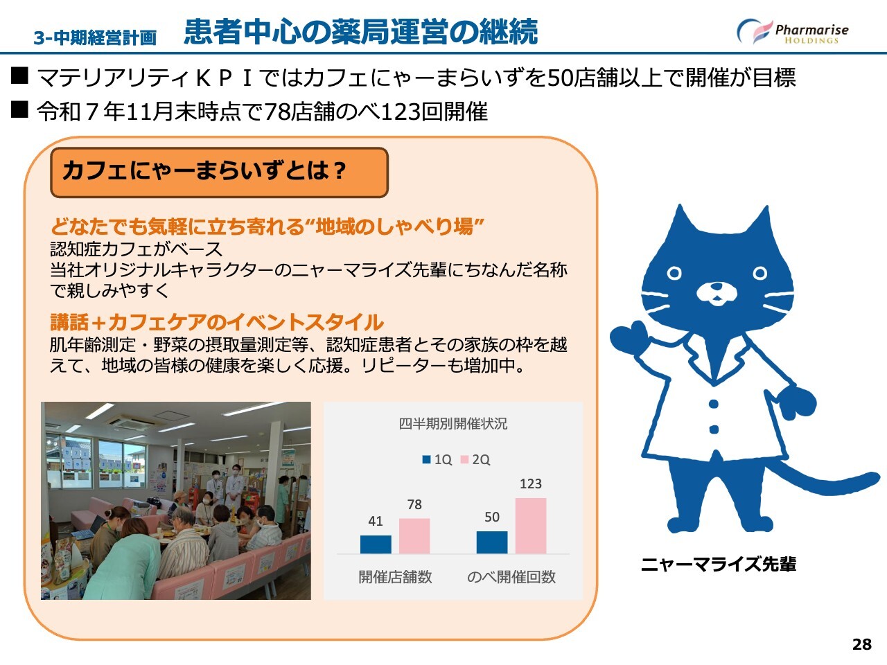 「患者中心の薬局運営の継続」に向けた取り組みの1つとして、「カフェにゃーまらいず」についてご説明します。当社グループの認知症カフェは、オリジナルキャラクター「ニャーマライズ先輩」にちなみ、「カフェにゃーまらいず」という名称で全国の店舗で開催しています。