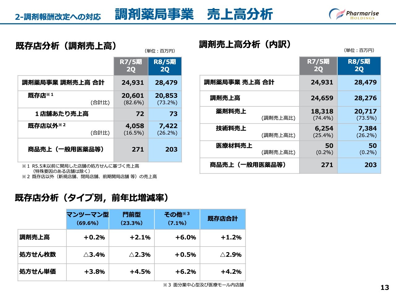 スライドは調剤薬局事業における売上高分析の表です。左上の表は、調剤薬局事業を既存店と新店などの既存店以外に分けて、前期と当期の第2四半期累計を比較するものです。右上の表は、全店舗の調剤売上高を薬剤料売上・技術料売上などの項目別に分けて、前期と当期の第2四半期累計を比較するものです。