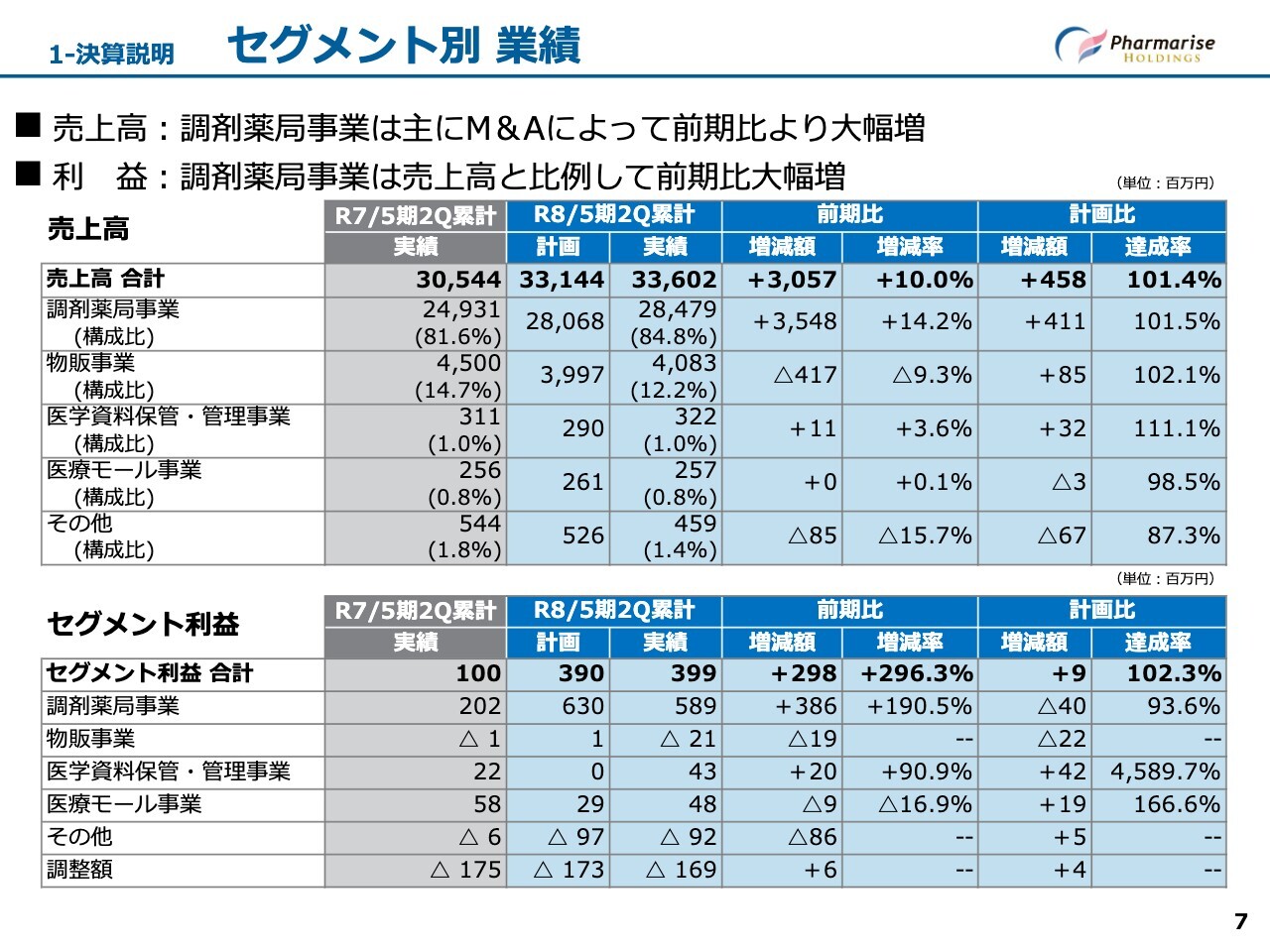 セグメント別の業績として、主に調剤薬局事業および物販事業セグメントの売上高についてご説明します。スライド上段の表はセグメント別の売上高、下段の表はセグメント利益です。