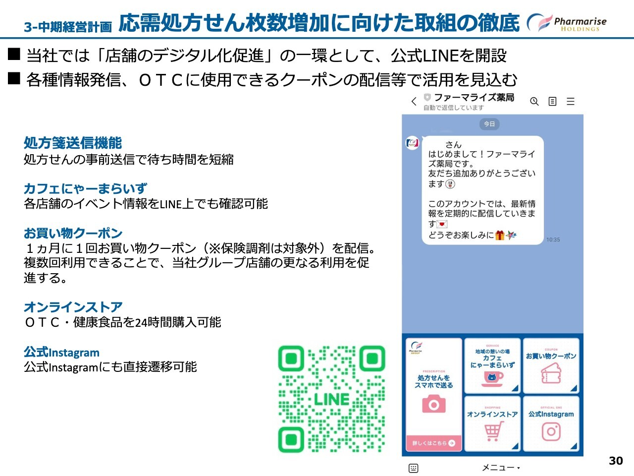 「公式LINE」を通じて、処方せん送信機能により待ち時間を短縮するほか、複数回利用可能なお買い物クーポンを配信してリピート率向上を図ることで、当社グループの店舗を選ぶ動機づけを行います。これらの施策を通じて処方せん枚数の獲得につなげたい考えです。さらに、「カフェにゃーまらいず」のイベント情報や「Instagram」への直接遷移機能も備えています。