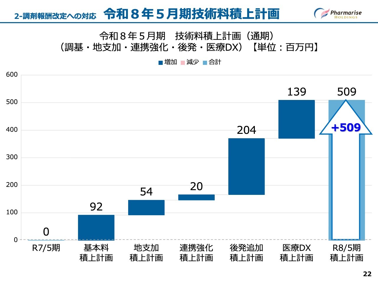スライドは、令和8年5月期における技術料の積上計画を示したグラフです。令和7年5月期を基準に、プラス5億900万円を計画しています。また、こちらには令和6年12月に取得したnext PH社の店舗分の8ヶ月分、約2億6,600万円も含まれています。