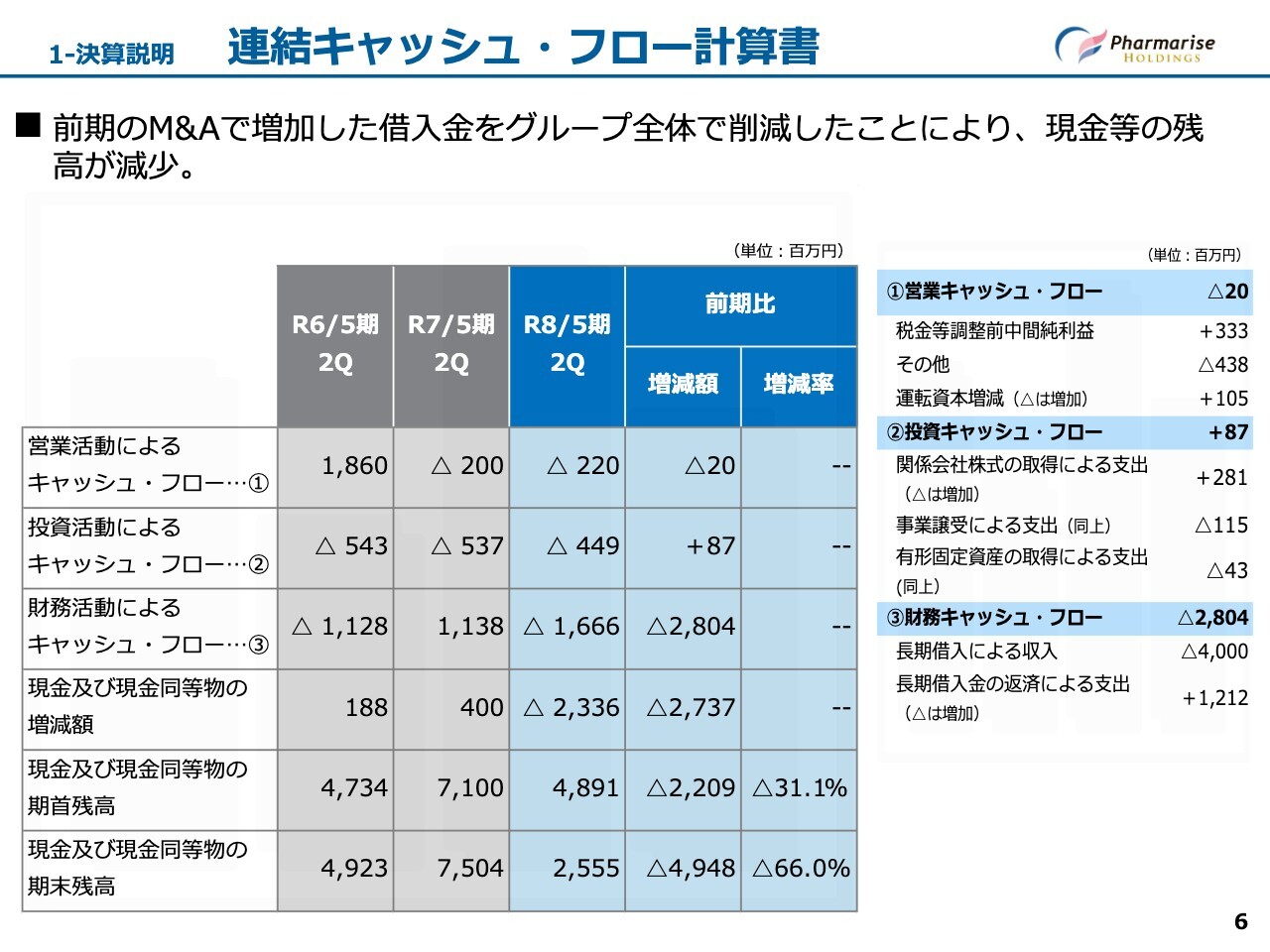 次に、投資キャッシュ・フローです。当中間期は、前期比でM&Aによる投下資金が少なかったことを主な要因として、前期比8,700万円改善のマイナス4億4,900万円となりました。ただし、引き続きM&Aによりグループインした会社のシステムを統一し、生産性向上に向けた投資を継続しています。