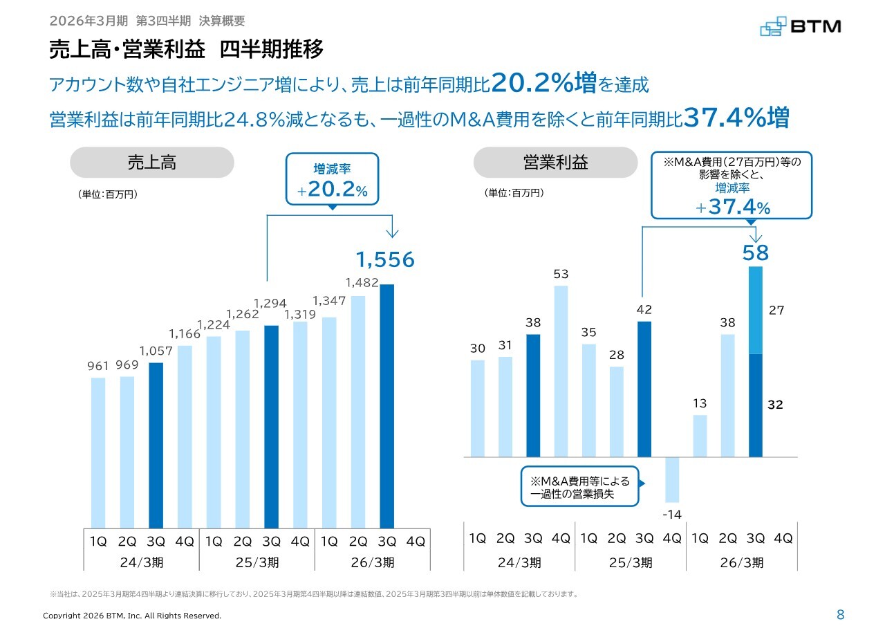 BTM、3Qの売上高は20%超の成長を達成 M&A費用調整後営業利益は37.4%増に拡大