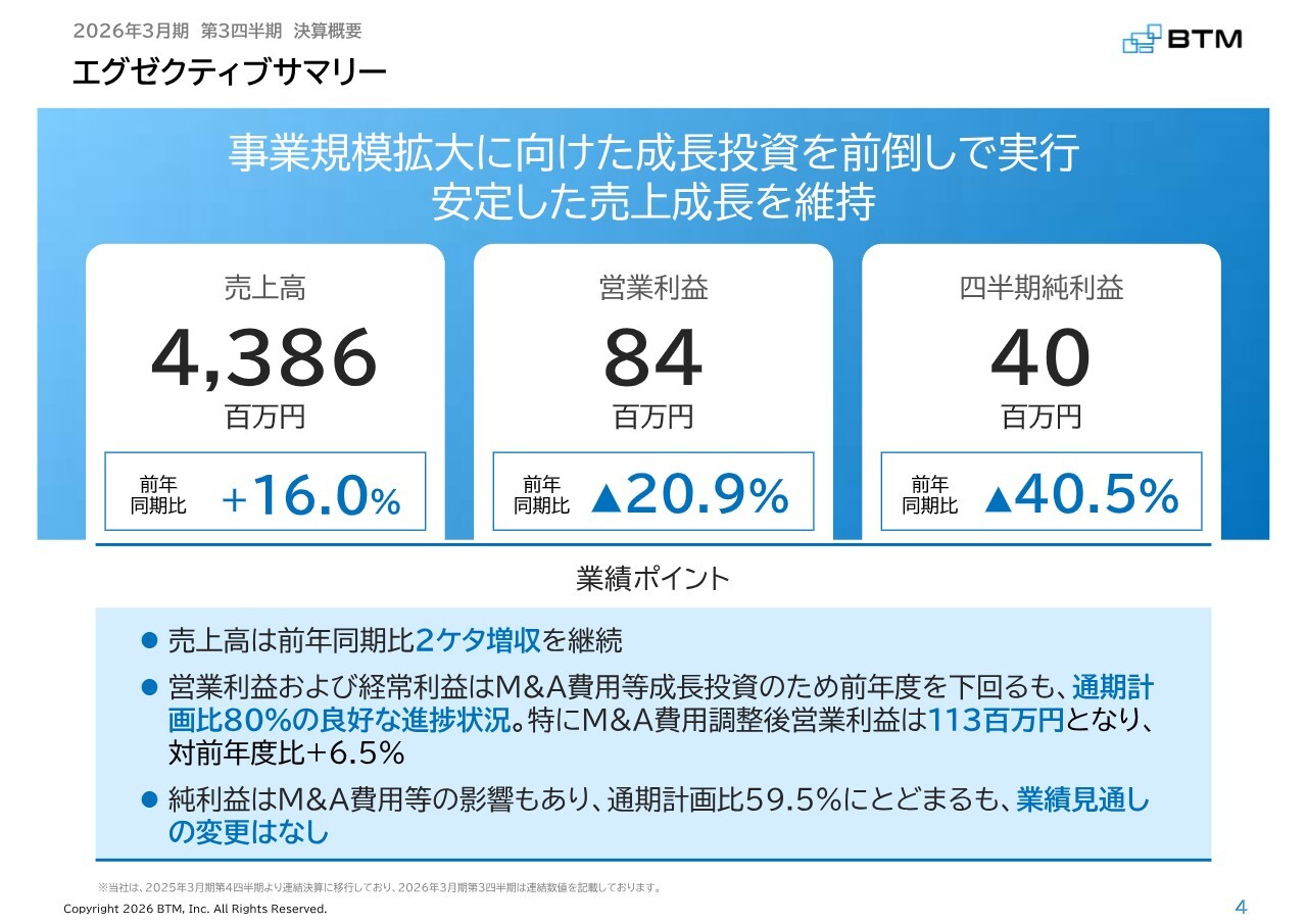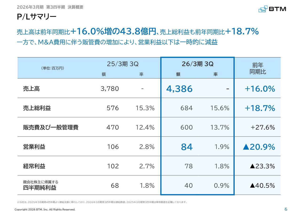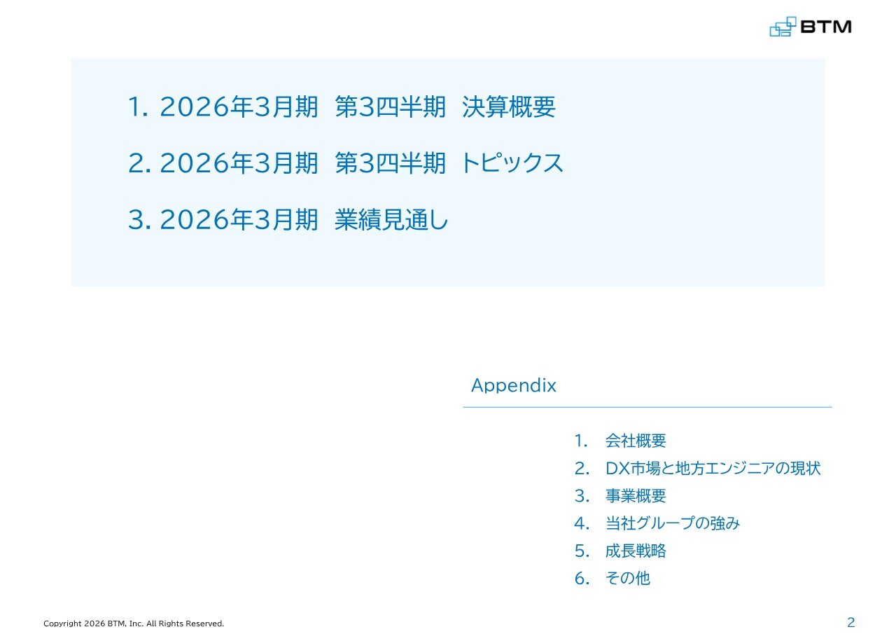 田口雅教氏:みなさま、お世話になっています。株式会社BTM代表取締役社長兼CEOの田口です。平素より当社をご支援いただき、誠にありがとうございます。それでは、2026年3月期第3四半期の決算説明を行います。
