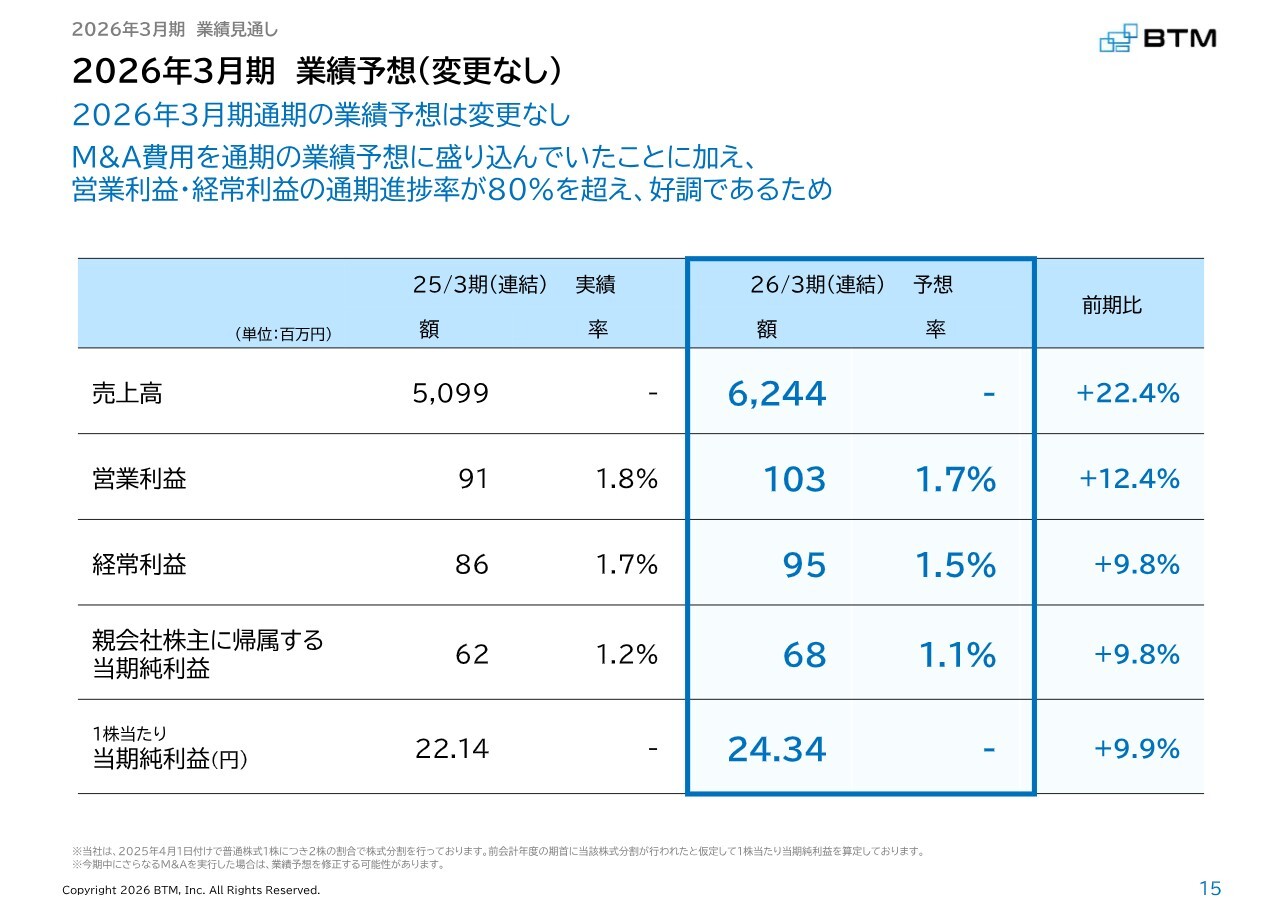 2026年3月期の業績見通しをお話しします。2026年3月期の業績予想に関しては、変更はありません。M&A費用を通期の業績予想に盛り込んでおり、さらに営業利益や経常利益の通期進捗率が80パーセントを超えているため、非常に好調であると判断し、変更は行っていません。