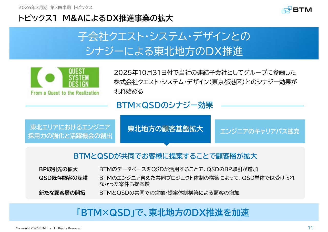 2026年3月期第3四半期のトピックスです。1つ目は、M&AによるDX推進事業の拡大です。子会社であるクエスト・システム・デザインとのシナジーにより、東北地方のDX推進が進められています。クエスト・システム・デザインは東京と山形に拠点があり、特に山形の拠点は規模が大きいのが特徴です。