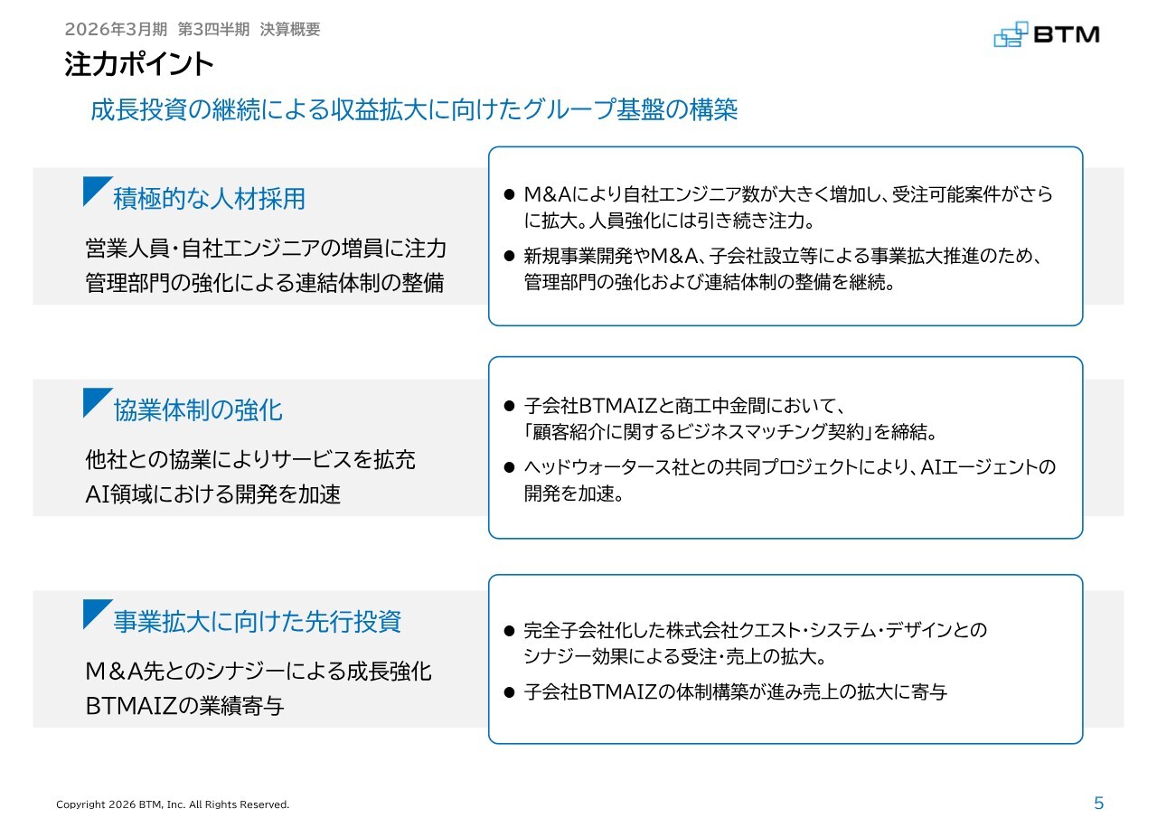 3つ目は「事業拡大に向けた先行投資」です。M&A先とのシナジーによる成長の最大化や、BTMAIZの業績寄与が挙げられます。完全子会社化した株式会社クエスト・システム・デザインとのシナジーが見え始めており、今後業績にも貢献できる見通しです。また、子会社であるBTMAIZの体制構築が進み、売上にも寄与できる状態になってきています。