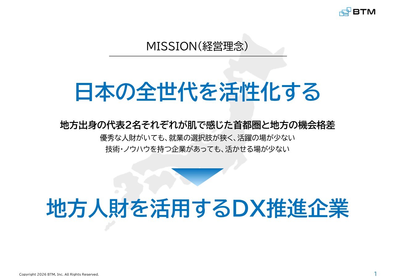 まず、当社のミッションです。当社は「日本の全世代を活性化する」というミッションを掲げています。私ともう1人の代表者は、かねてより地方と首都圏の機会格差に課題意識を持っており、その是正を目指す思いで会社を設立しました。