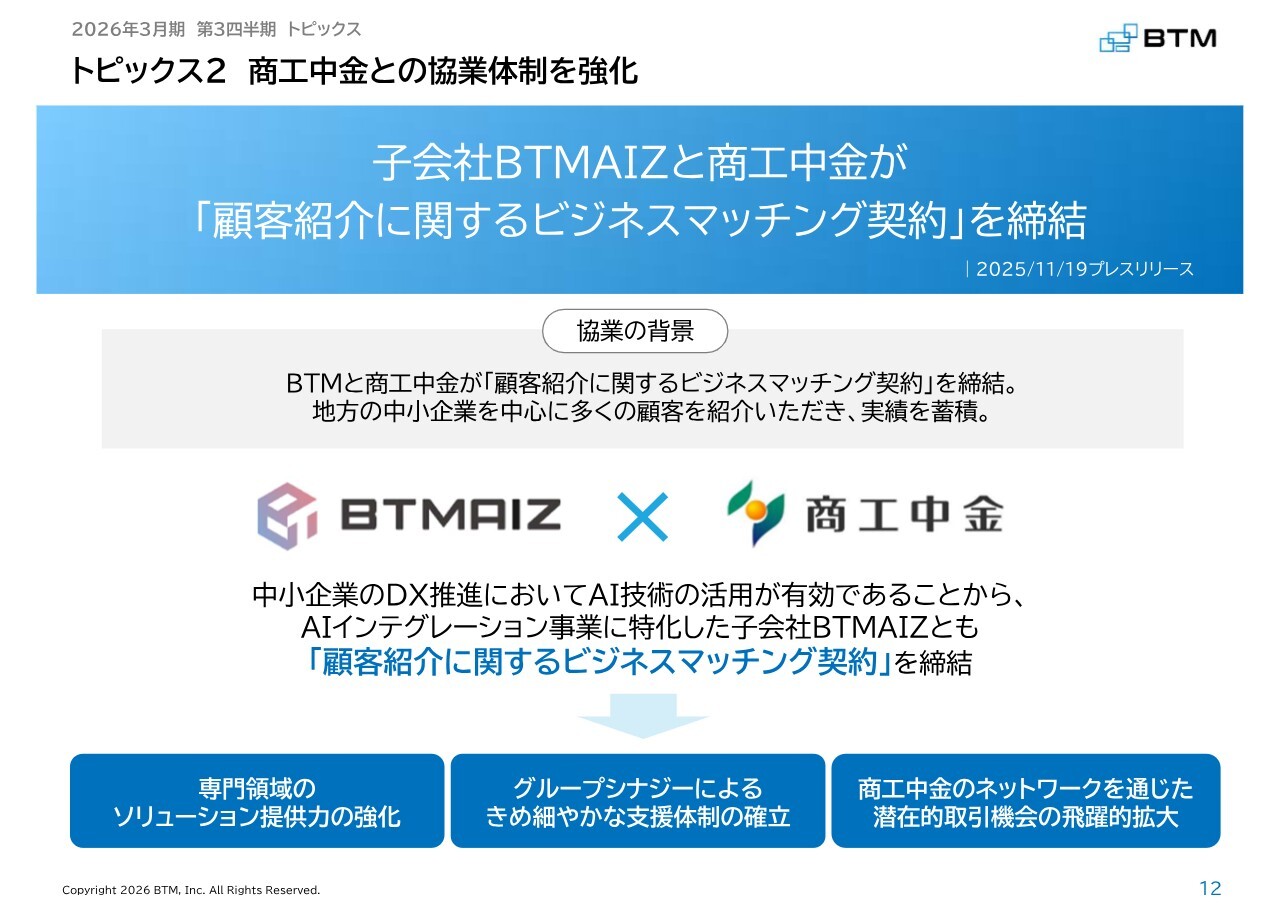 トピックスの2つ目です。商工中金との協業体制ですが、子会社である株式会社BTMAIZが商工中金とビジネスマッチング契約を締結しています。