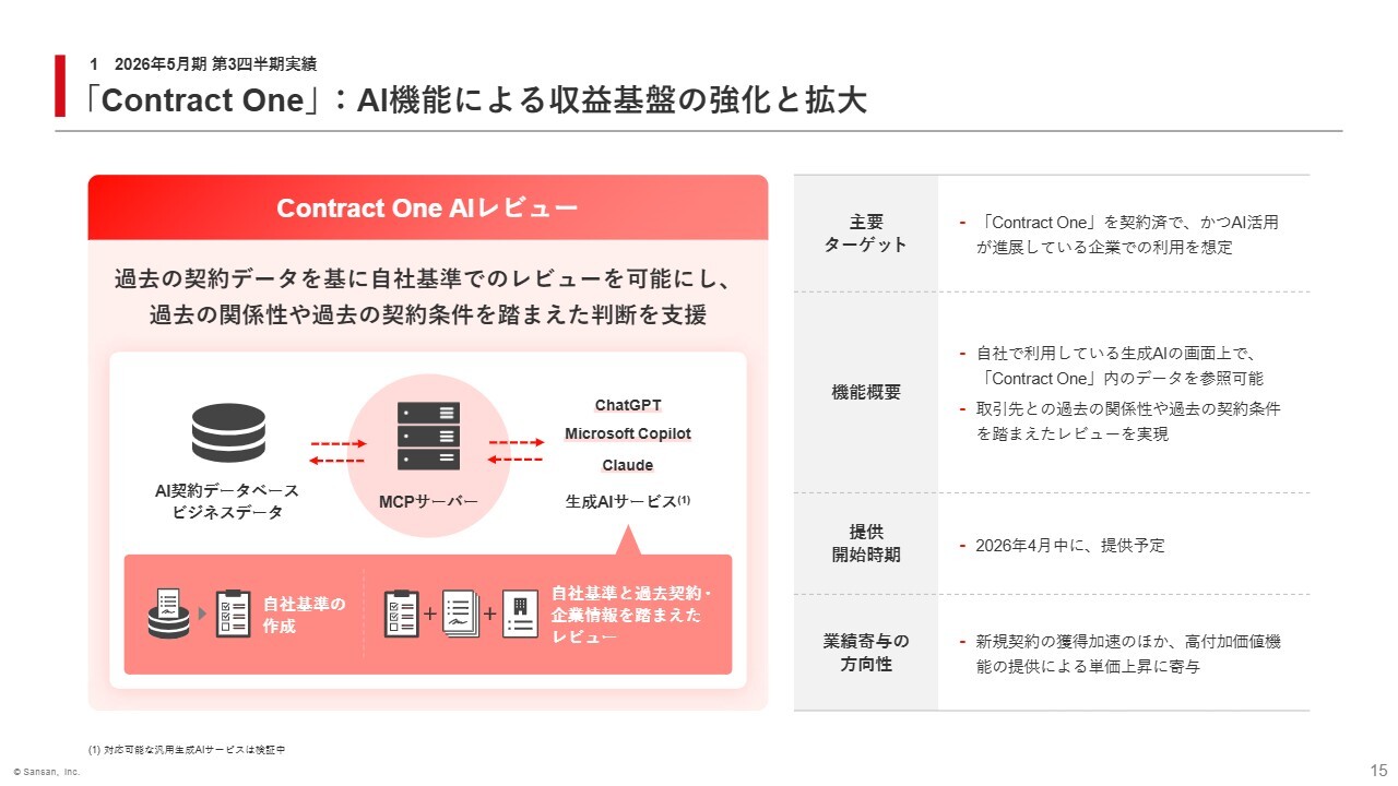 「Contract One AIレビュー」は2026年4月中の提供開始を予定しており、「Contract One」の提供価値を一段と高めることで、新規契約の獲得を含めた事業のさらなる成長につなげていきます。