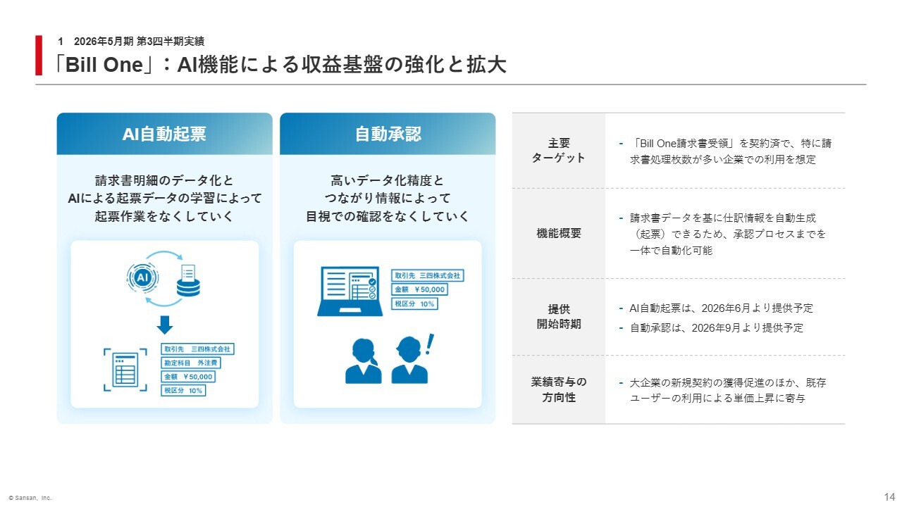 さらに、新たな機能として検討している「自動承認」では、起票された内容と請求書データをAIで自動的にチェックして、承認プロセスを簡素化します。機能提供前にもかかわらず、当第3四半期においてすでに本機能の利用を前提とした新規受注も獲得する等、多くの反響をいただいており、本機能も今後の「Bill One」の成長に寄与してくれることを期待しています。