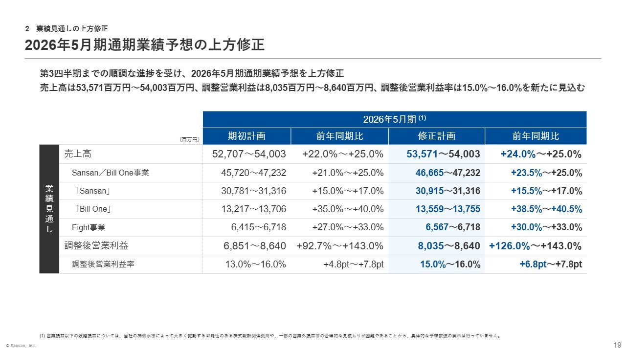 ここまでをあらためて振り返ると、売上高・利益ともに順調に推移しており、なかでも利益については想定を上回るペースでの進捗となっています。高成長を続ける「Bill One」の赤字額が大きく縮小したことに加え、大きな収益基盤である「Sansan」が安定して利益を創出するフェーズにある構造そのものが大きく寄与しています。