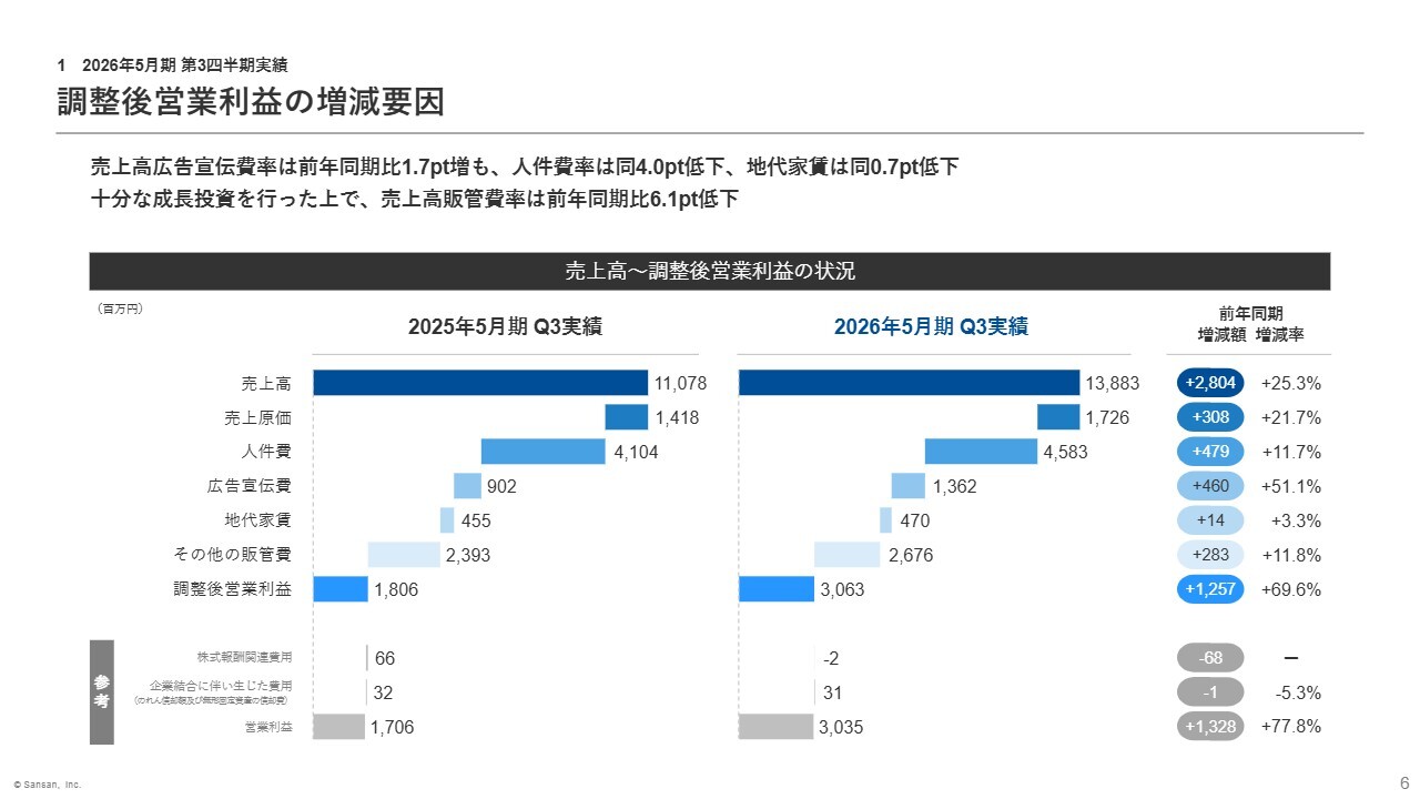 その結果、販管費率は前年同期比で6.1ポイント低下し、成長に必要な投資を継続しながら、調整後営業利益は前年同期比69.6パーセント増の大幅な増益となっています。