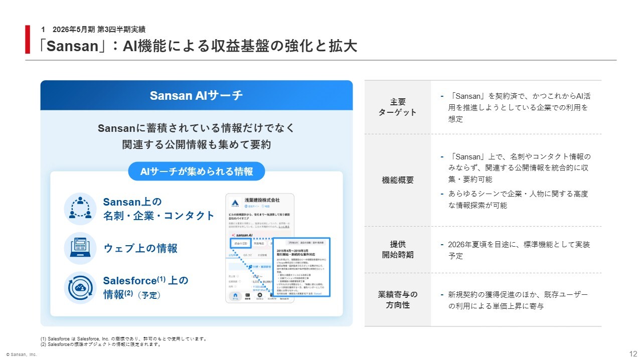 これらの機能については、段階的な先行提供等を行いながら、今年の夏頃を目指して正式に実装していく予定です。AI機能の拡充によって新規顧客の獲得・促進だけではなく、既存顧客の単価上昇にも期待できるものと考えています。