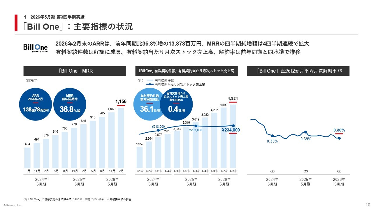 続いて、「Bill One」のKPIについて10ページをご覧ください。スライド左側のグラフのMRRは、前年同期比36.8パーセント増の約11億5,600万円となりました。第2四半期末からは約8,600万円の純増となり、四半期純増額は4四半期連続で拡大しています。