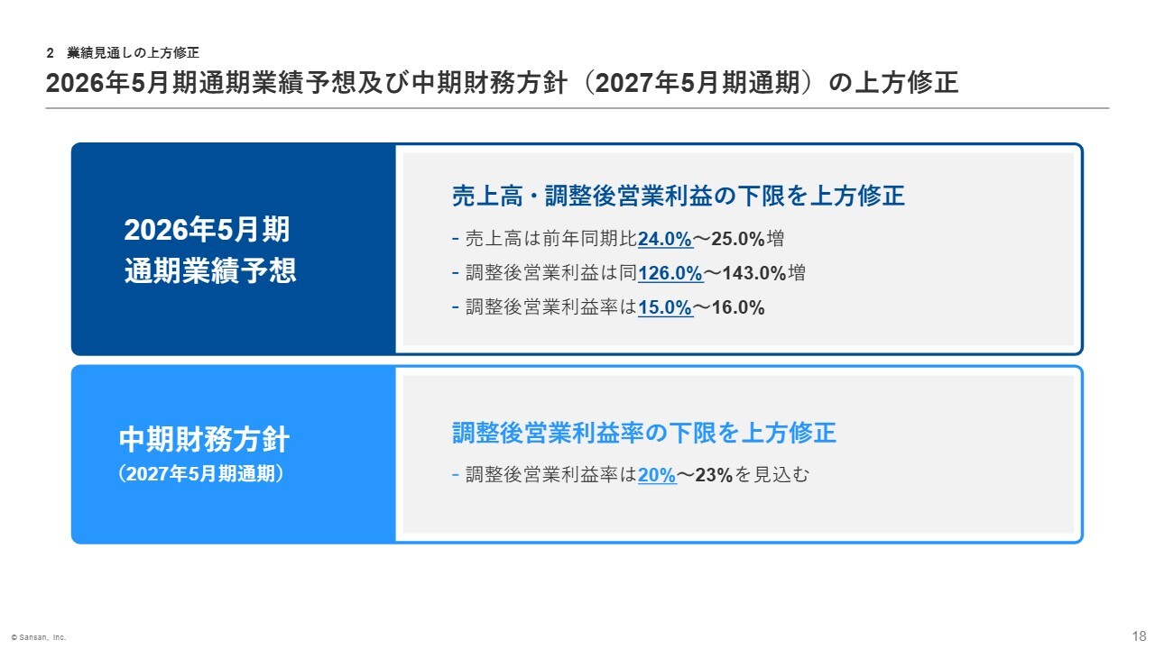 次に、業績見通しの上方修正についてご説明します。18ページをご覧ください。第3四半期までの業績推移を受けて、2026年5月期の通期業績予想と中期財務方針を上方修正したので、順にご説明します。