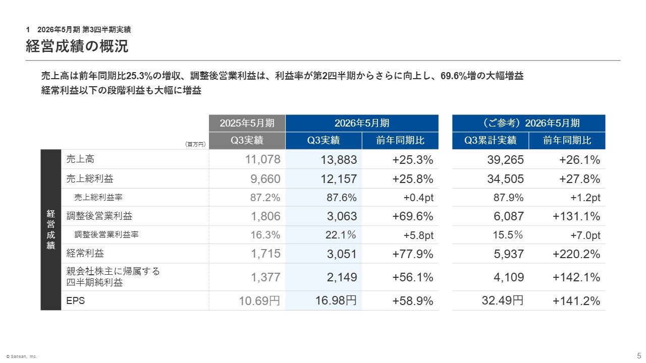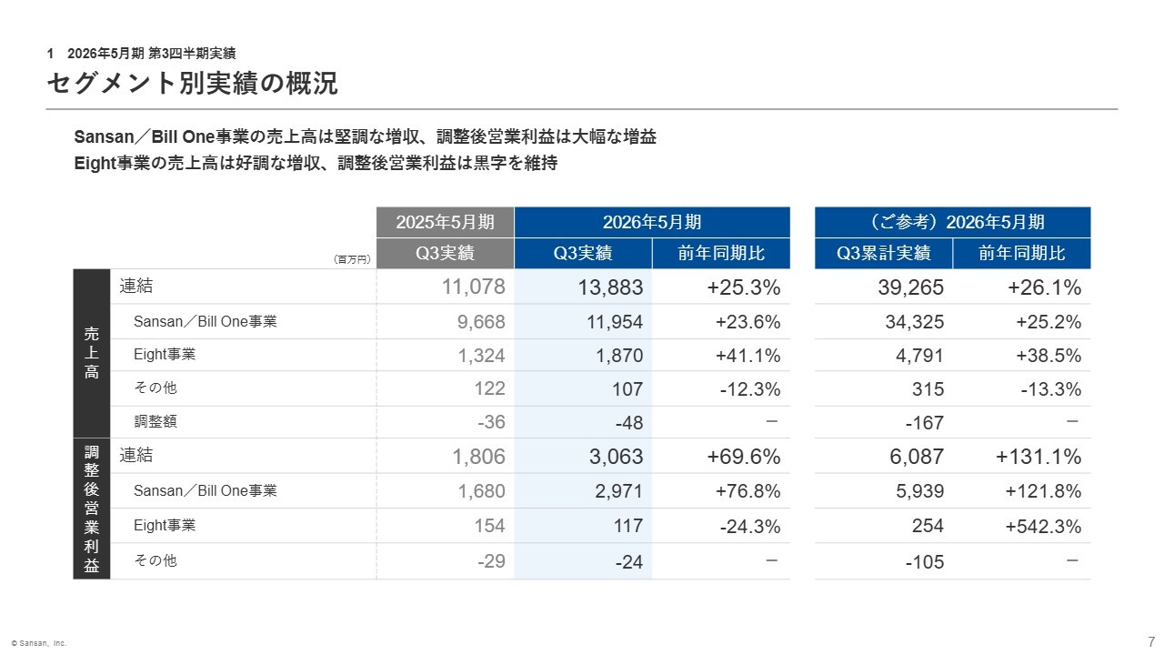 4ページをご覧ください。2026年5月期第3四半期累計実績のハイライトです。1点目に、売上高は前年同期比26.1パーセント増となり、堅調な成長を維持しました。調整後営業利益は、経理AXサービス「Bill One」の赤字縮小等により前年同期比131.1パーセント増となり、過去最高益を達成しました。