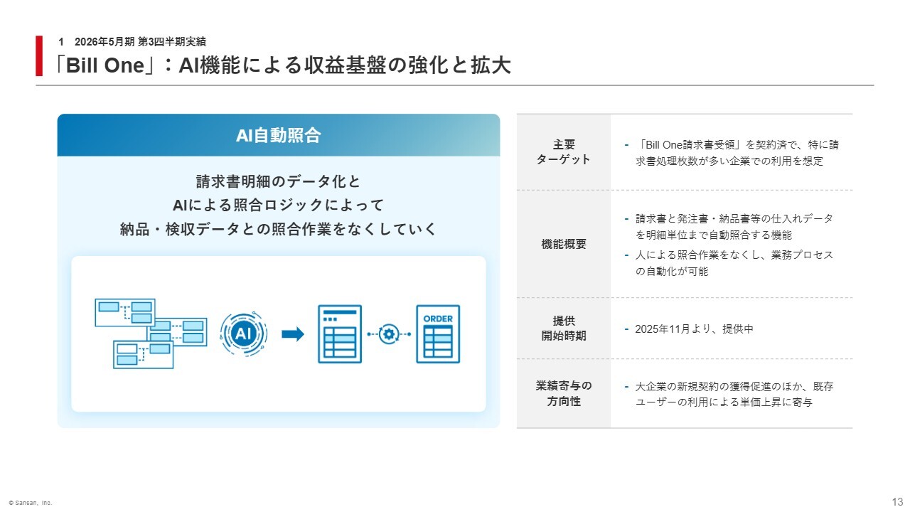 続いて、「Bill One」についてもAIを活用した機能の状況と業績寄与についてご説明します。まず、昨年11月にオプション機能として「AI自動照合」の提供を開始しました。これは、企業が受領した請求書や納品書の内容と、発注書や検収書等の仕入れに関する内容を、総額や明細単位で照合する機能になっています。
