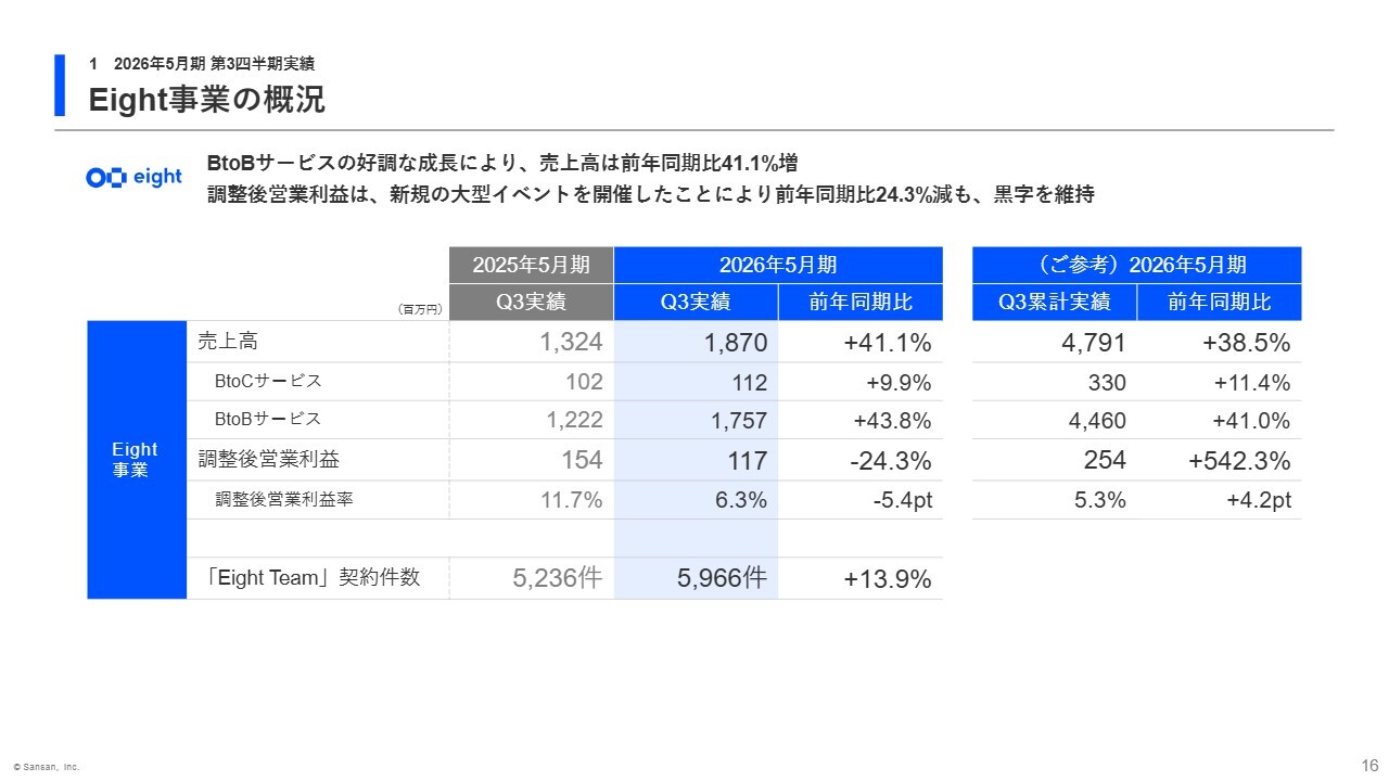 続いて、Eight事業についてご説明します。16ページをご覧ください。BtoCサービスの売上高は前年同期比9.9パーセント増となりました。BtoBサービスの売上高は、ビジネスイベントの堅調な成長や採用関連サービスの好調な成長などにより、前年同期比で43.8パーセント増となり、これらの結果、Eight事業全体の売上高は前年同期比41.1パーセント増となりました。