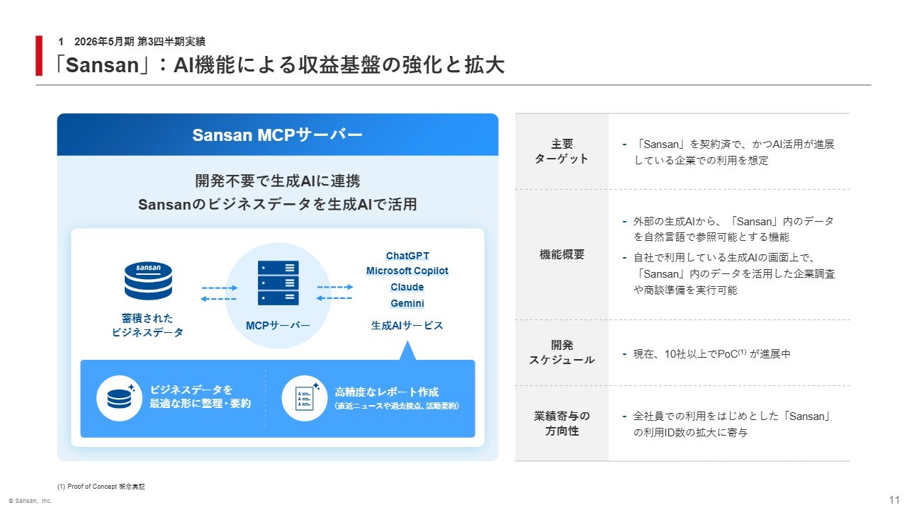 まず、2025年5月期の通期決算でご紹介した「Sansan MCPサーバー」です。本機能は、ユーザーが自社で利用している「Microsoft Copilot」等の生成AIから、「Sansan」上に蓄積された名刺情報やコンタクト履歴を直接呼び出せるようにする仕組みで、いわば「Sansan」と外部の生成AIをつなぐ橋渡しの役割を担います。