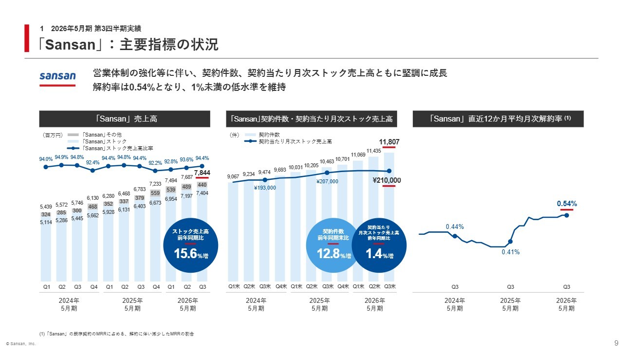 「Sansan」のKPIについてご説明します。スライド左側に示すとおり、ストック売上高は前年同期比15.6パーセント増と堅調な成長を継続しました。