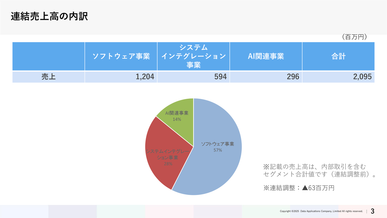 最も大きな売上の割合を占めているのがソフトウェア事業で、12億400万円となっています。これは、全体の57パーセントになります。次に、システムインテグレーション事業が5億9,400万円で28パーセント、AI関連事業が2億9,600万円で14パーセントとなっています。なお、連結調整として6,300万円が含まれており、これは主にグループ内取引の消去によるものです。