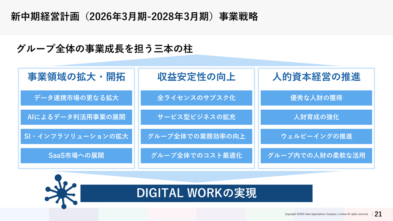 2026年3月期中間期の主なトピックスについてご説明します。2026年3月中間期は、スライドに記載の新中期経営計画の施策を中心に事業を展開しました。事業成長を担う3本の柱として、事業領域の拡大・開拓、収益安定性の向上、人的資本経営の推進を設定し、戦略を立案しています。