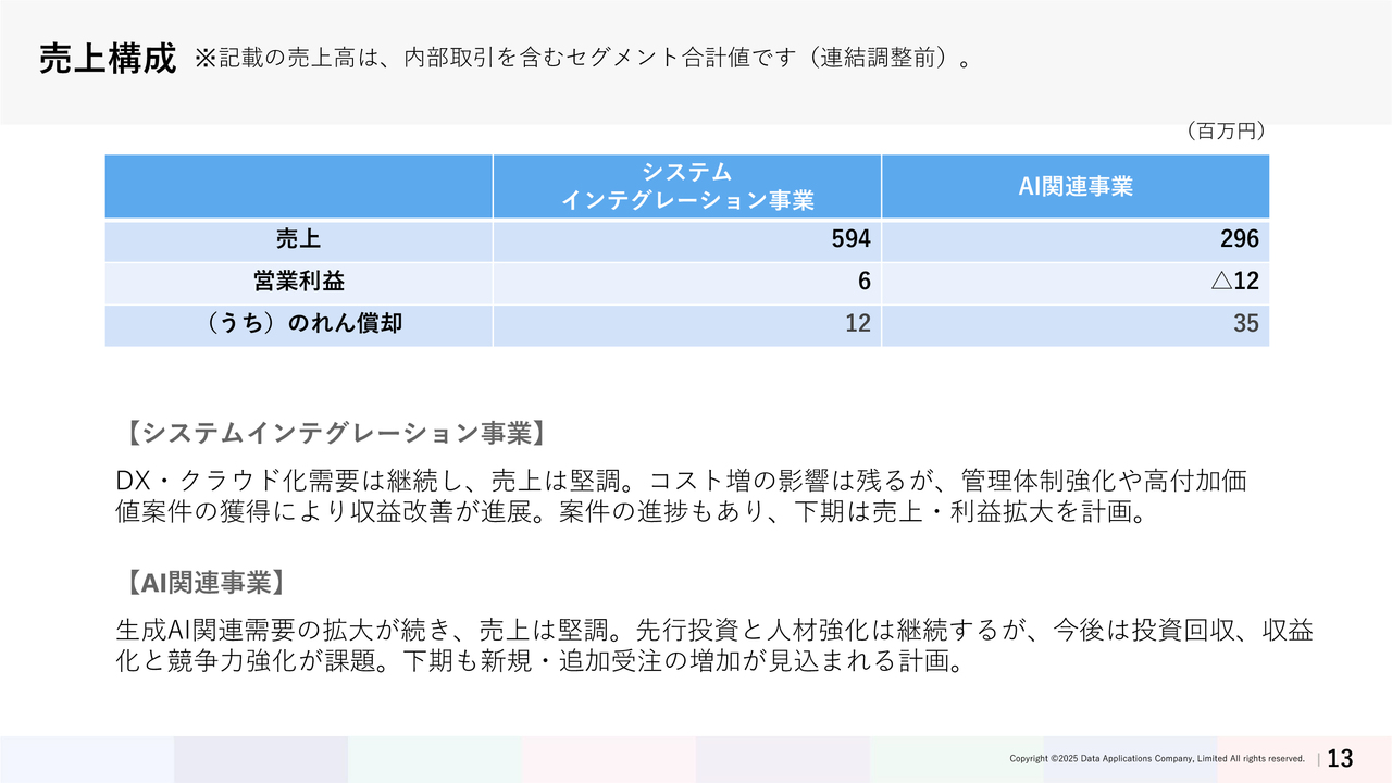 続いて、システムインテグレーション事業およびAI関連事業の売上構成と損益状況についてご説明します。なお、こちらのスライドで示している売上高は、セグメント間の内部取引を含む合計値であり、外部顧客への売上のみを対象としたものではありません。