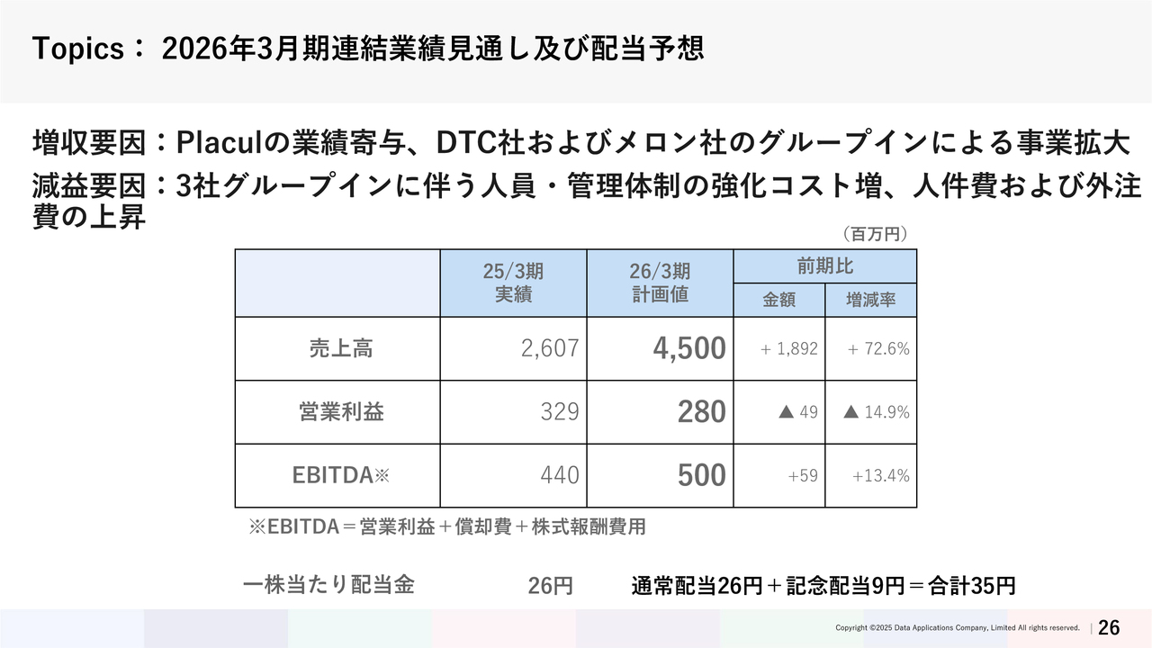 また、配当予想については、株主のみなさまへの安定的な利益還元を重視する方針に変更はありません。なお、2026年3月期は、通常配当26円に記念配当9円を加えた、合計35円を予定しています。