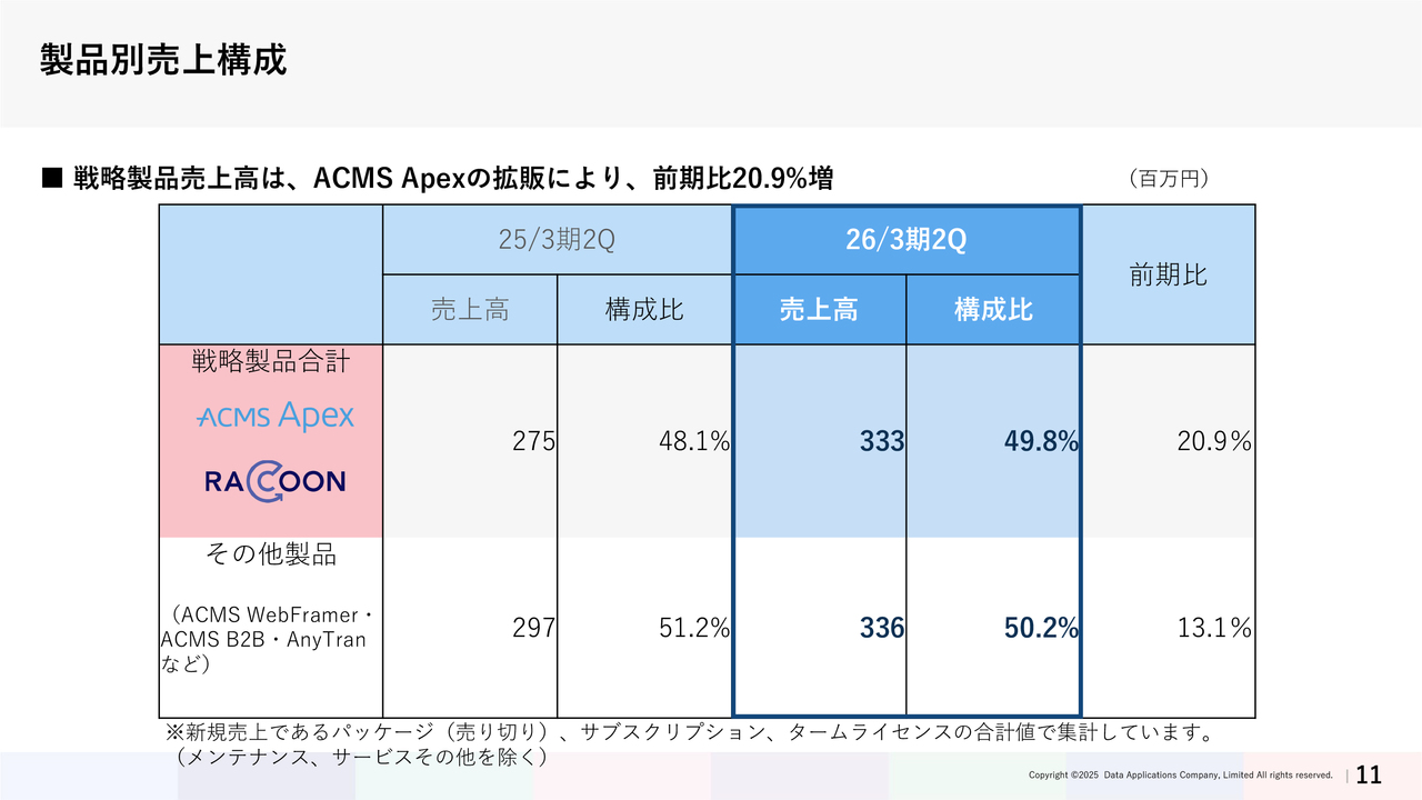 製品別の売上構成についてご説明します。戦略製品の売上高は、「ACMS Apex」の拡販により前期比20.9パーセント増となっています。また、戦略製品は売上構成比で49.8パーセントと、全体の約半分を占めています。