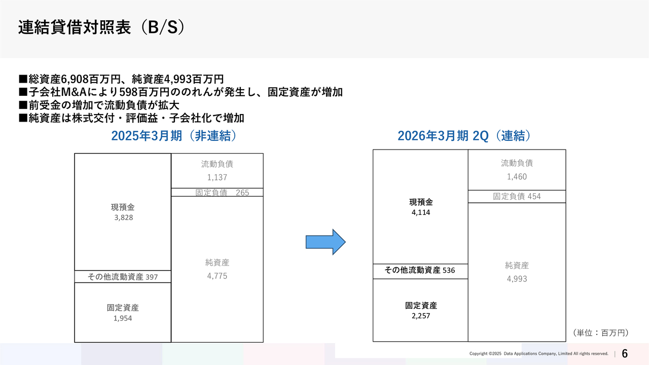 前受金の増加に伴い流動負債が拡大しました。純資産は、株式交付・評価益・子会社化によって増加しています。