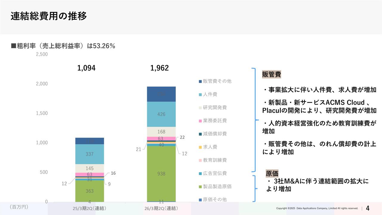 次に、原価の増加については、連結対象となった3社の追加により拡大しています。当社グループの中核をなすソフトウェア事業は、原価構造が労務費中心であり、システムインテグレーション事業やAI関連事業についても、事業特性上、労務費の比重が高い傾向にあります。