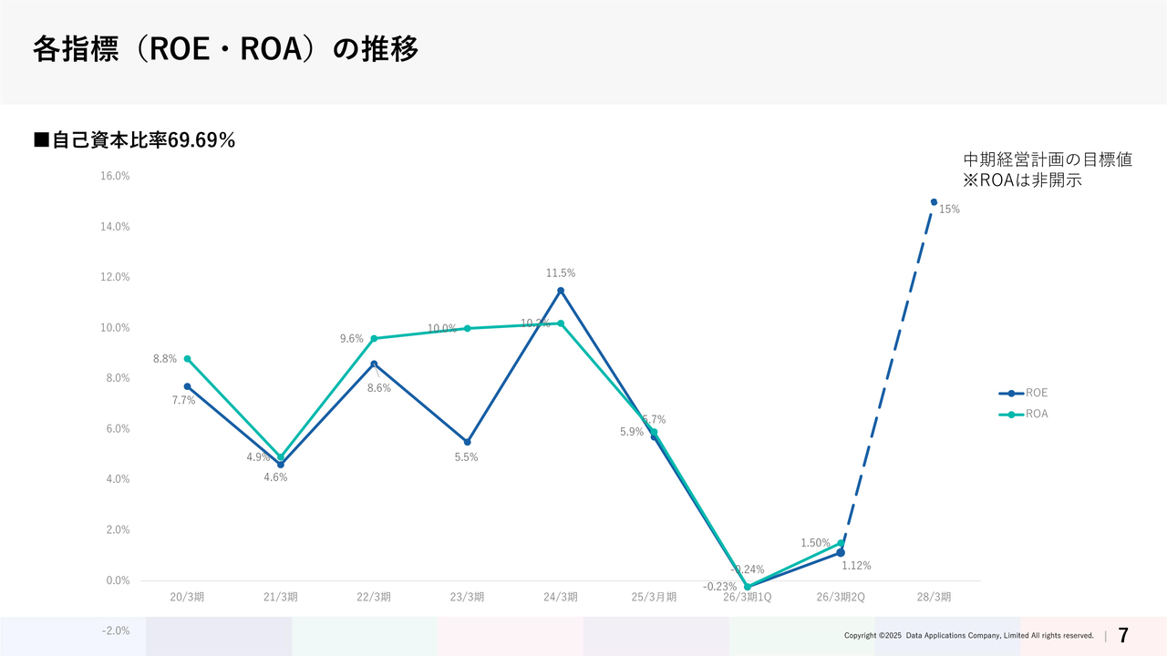 スライドは、ROEおよびROAの推移についての参考情報です。当社では、中期経営計画に掲げているとおり、資本コストや株価を意識した経営を実施するとともに、2028年3月期にROE15パーセント以上を目指しています。自己資本比率は69.69パーセントと安定的に推移しています。