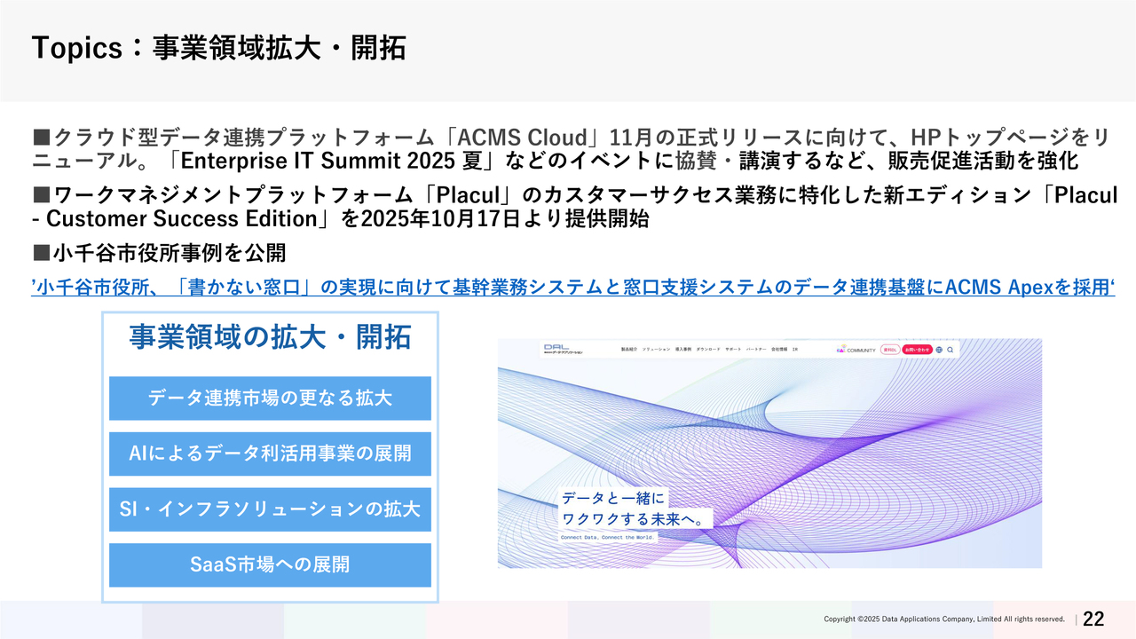 事業領域拡大・開拓の進捗についてです。クラウド型データ連携プラットフォーム「ACMS Cloud」については、2025年11月末の正式リリースに向けて、ホームページのトップページをリニューアルしました。