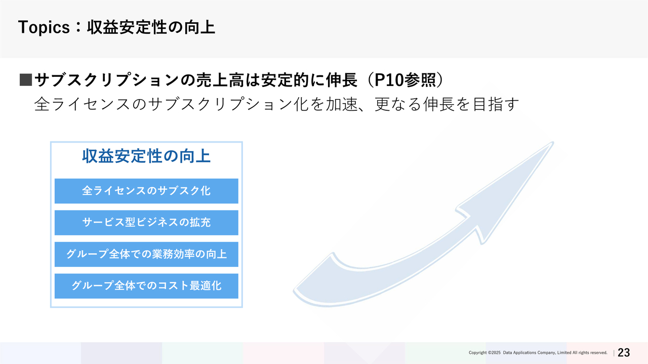 収益安定性の向上については、サブスクリプションの売上高が安定的に進捗しており、全ライセンスのサブスクリプション化を加速させ、さらなる成長を目指しています。