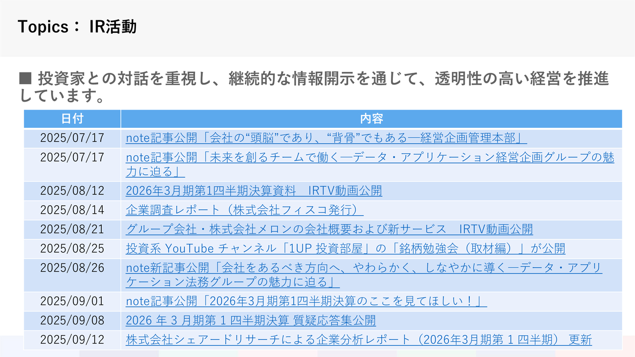 最後に、当社のIR活動についてご説明します。当社は、株主・投資家との対話を重視し、継続的な情報開示を通じて透明性の高い経営を推進しています。今後もさまざまなチャネルを通じて積極的に情報を発信し、これらの活動を通じて投資家のみなさまとの信頼関係を築き、企業価値の向上につなげていきます。