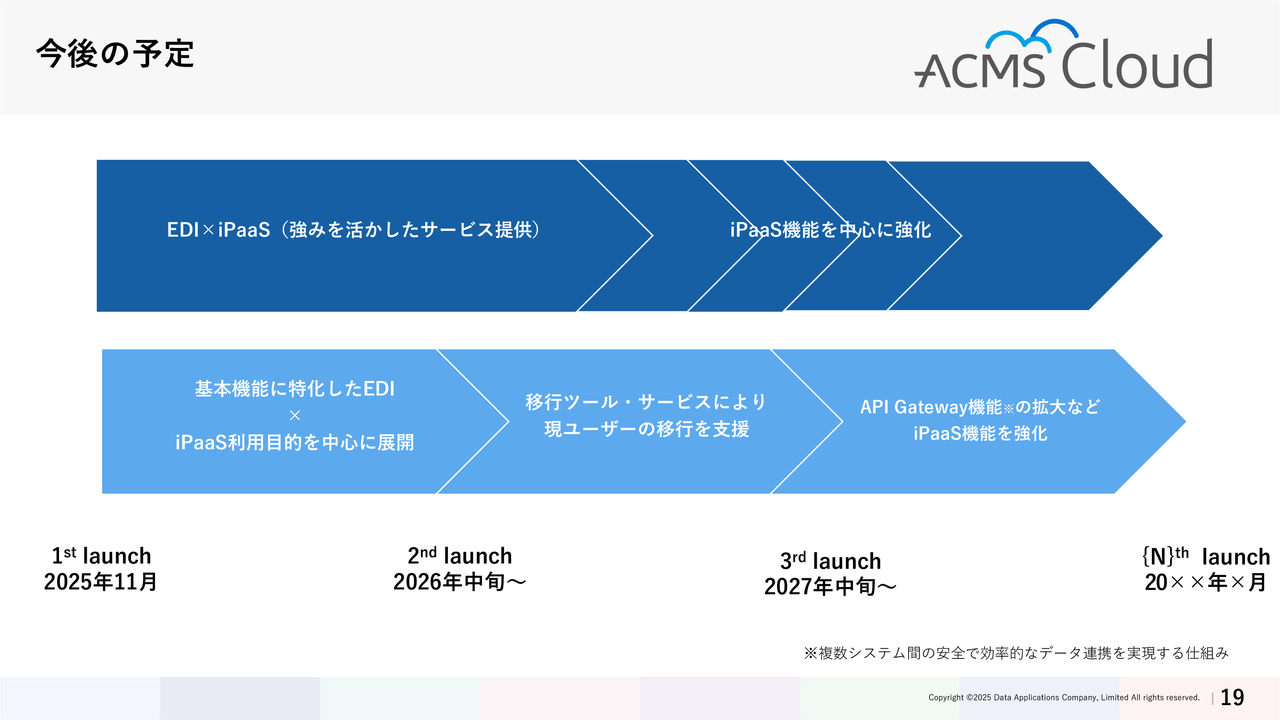 また、「ACMS Cloud」は従来の「ACMSシリーズ」の強みを活かしつつ、クラウド時代に対応する新たなデータ連携プラットフォームとして開発を進めており、現在、要求仕様やビジネスプラン、価格体系が決定段階にあります。