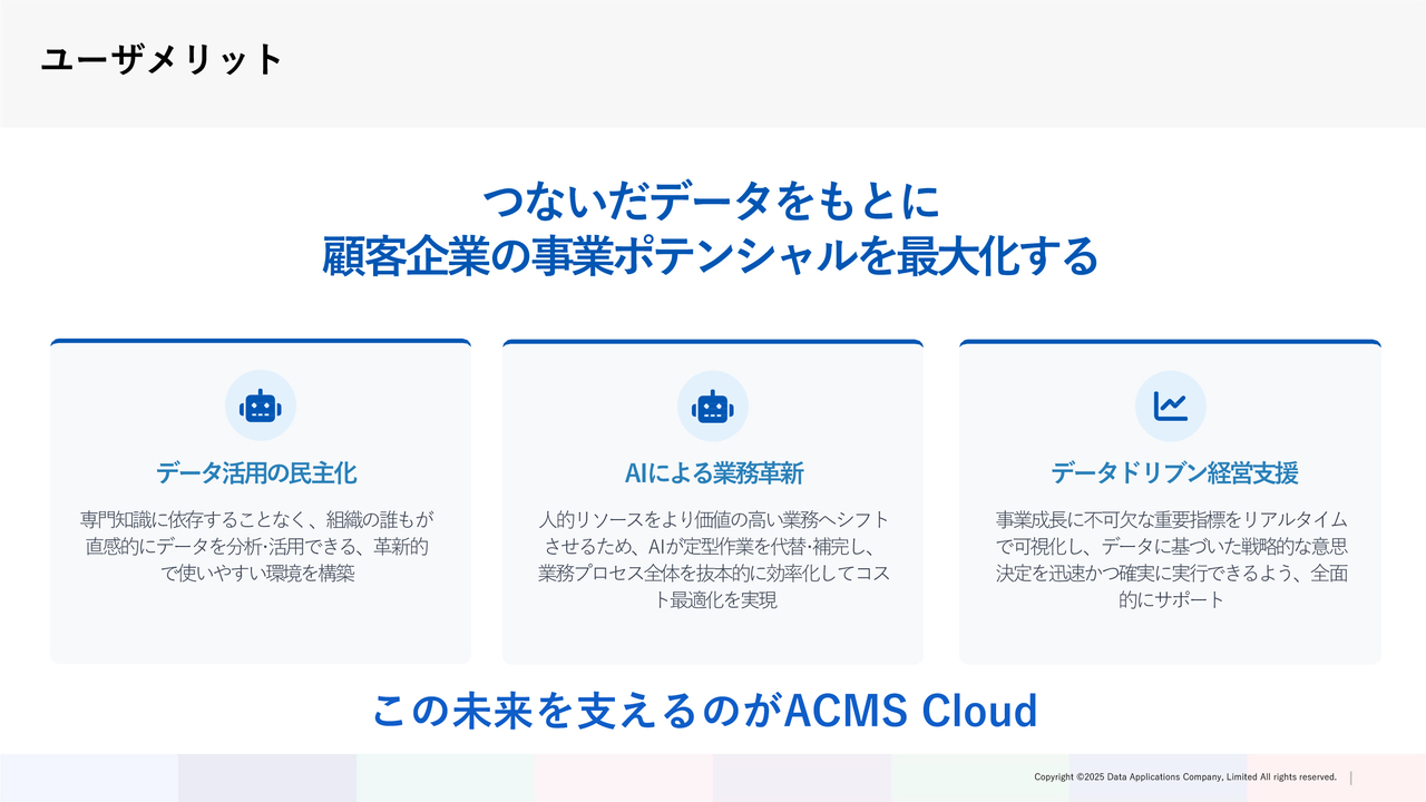「ACMS Cloud」は、つないだデータをもとに顧客企業の事業ポテンシャルを最大化し、未来を支えるプラットフォームとなることを目指します。