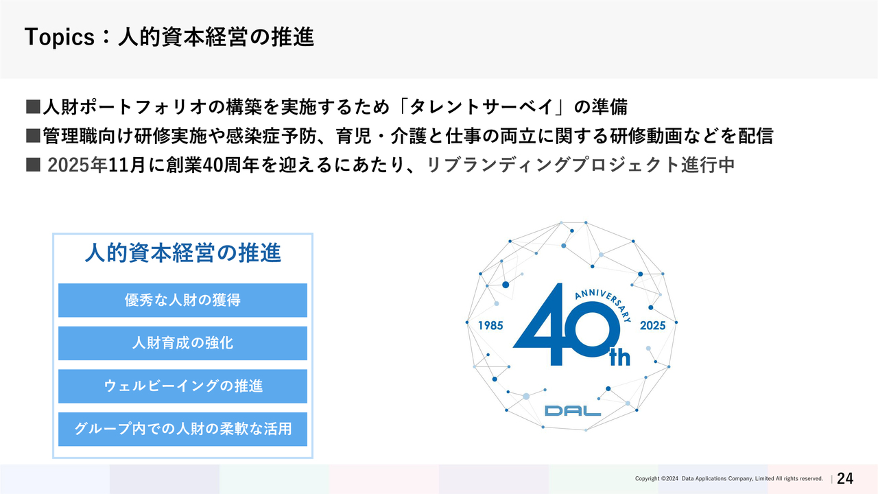 人的資本経営の推進の進捗についてです。当社では、優秀な人財の獲得、人財育成の強化、ウェルビーイングの推進、さらにグループ内での人財の柔軟な活用を柱として、人的資本の価値最大化を目指しています。