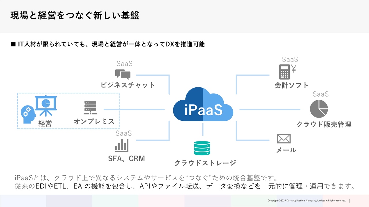 「ACMS Cloud」は、IT人材が限られていても、現場と経営が一体となり、DXを推進することができる統合基盤です。クラウド上で異なるシステムやサービスをつなぎ、従来のEDI、ETL、EAI機能を統合します。