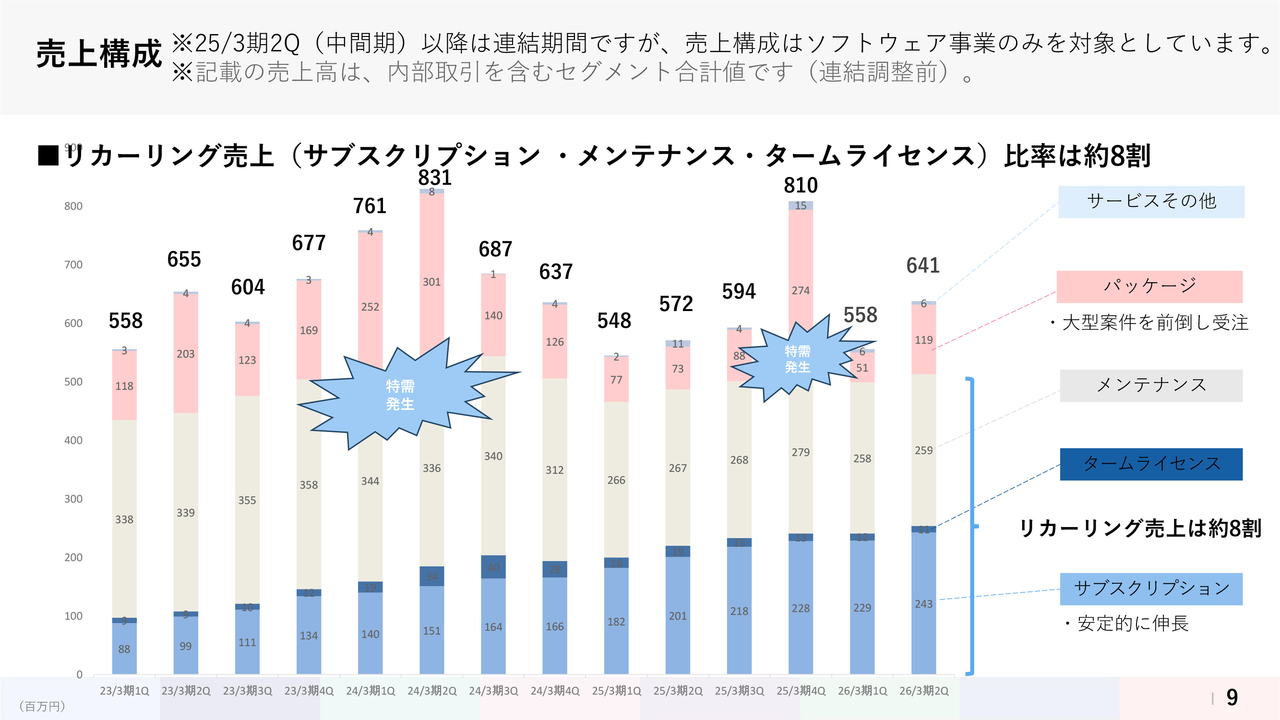 まず、ソフトウェア事業の売上構成についてご説明します。注意点として、2025年3月期中間期以降は連結期間となりますが、こちらのスライドにある売上構成はソフトウェア事業のみを対象としており、過去の数値を調整しています。また、記載している売上高は、内部取引を含むセグメント合計値です。